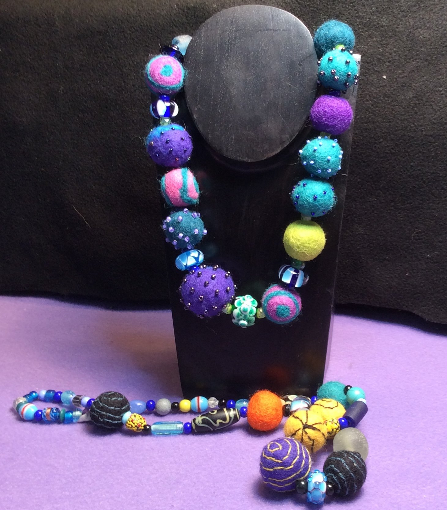 Artist Bio & Description: My stop on the studio tour showcases Felt Beading, a rare art form I’ve mastered. Each whimsical, one-of-a-kind necklace blends these unique felt beads with variety of vintage and ethnic beads; collected over decades of thrift shop and flea market hunting along the West coast.